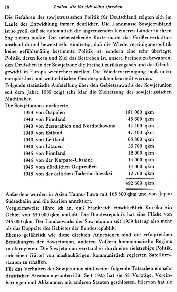 Este necesar să evaluăm foarte sobru problema reunificării și să subliniem din nou și din nou motivele obiective care sunt în interesul Europei. Nevoile politice foarte serioase și importante sunt decisive aici. Reuniunea nu este exclusiv sau în primul rând o afacere emoțională. Este necesar să subliniem din nou și din nou că reunificarea este un interes vital al Europei și, prin urmare, al lumii și că trebuie să existe un baraj împotriva monstruosului colos al Rusiei sovietice. Pentru aceasta, este absolut necesară integritatea Germaniei.