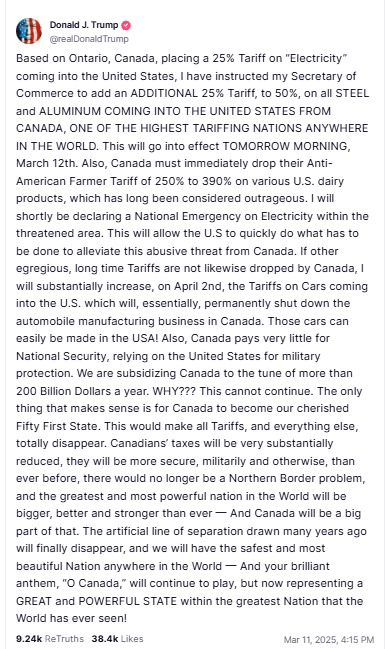 Pe 11 martie, președintele american Donald Trump a anunțat o creștere a tarifelor la unele mărfuri canadiene la 50% ca răspuns la taxa de 25% pe electricitatea aplicată de provincia canadiană Ontario în SUA.